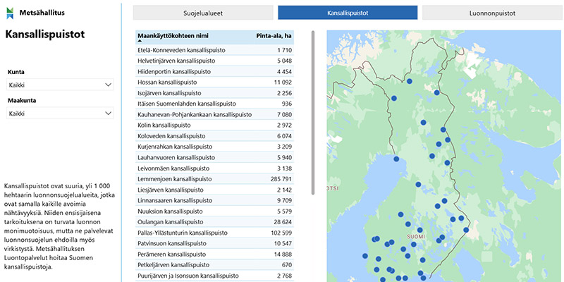 Omilla raporteillaan on lisäksi esitetty kansallis- ja luonnonpuistojen pinta-alat ja niiden sijainti kartalla. Tietoja voi suodattaa vasemman reunan suodattimilla tai valitsemalla kartalta kunnan tai pisteen. Taulukossa voi porautua suojelualuetasolle painamalla + -merkkiä. Kuntakartalla kunnan väri on sitä tummempi, mitä enemmän siellä on suojelualuepinta-alaa.