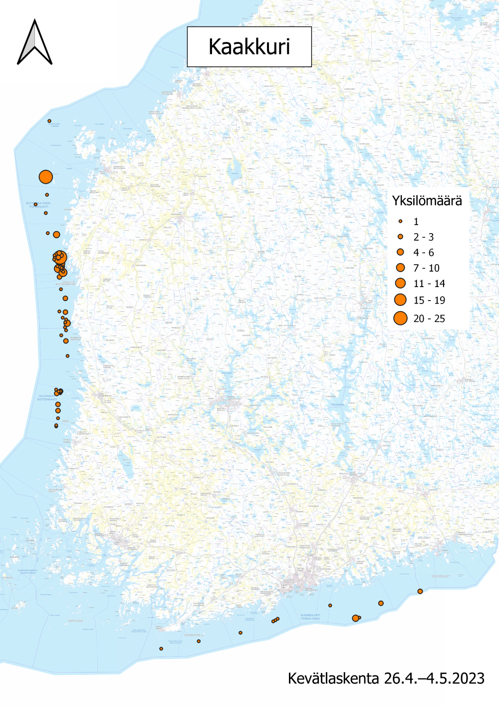 Viisipäiväisessä kevätlaskennassa huhti-toukokuun vaihteessa keskityimme lintuihin, jotka levähtävät ulkomeren alle 20 metriä syvillä alueilla. Tähtäimessämme olivat eritoten alli ja muut sukeltajasorsat. Kesäkuun lopussa etsimme kahden päivän ajan ulkosaaristosta ja ulkomereltä erityisesti sulkivia haahkakoiraita. Loka-marraskuun vaihteessa laskimme syksyisen tilanteen samoilta alueilta kuin keväällä. Kevät- ja syyslaskenta ulottuvat Suomenlahden itäosasta Merenkurkkuun asti. Kesäkierrokselta Suomenlahden itäosa jätettiin pois, koska haahkojen ei ole siellä havaittu kerääntyvän suuriksi parviksi sulkasatoaikaan. Ahvenanmaan merialueella laskennat tekee Turun ammattikorkeakoulu. Muut alueet ovat meidän, Suomen ympäristökeskuksen tutkijoiden vastuulla. Tämän blogitekstin kokemukset ja lintujen lukumäärät ovat Syken laskenta-alueelta. Lentolaskennat toistetaan vuonna 2026.