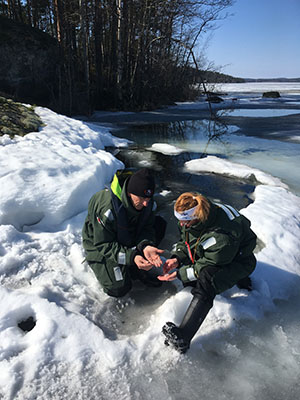 Kuvassa saimaannorpan pesälaskijat tutkivat pesäpaikalle jäänyttä kuutin karvaa. Kuva: Metsähallitus, Sirpa Peltonen.