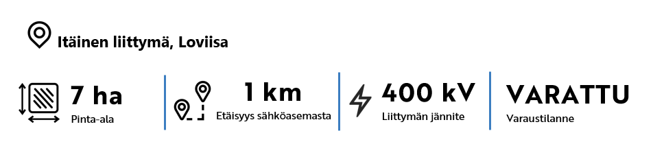 Loviisan itäisen liittymän alue on asemakaavoitettu teollisuustontti, joka tarjoaa hyvät edellytykset sähköverkkoyhteyksien hyödyntämiseen. Alue sijaitsee Fingridin kantaverkon välittömässä läheisyydessä ja kohtuullisen etäisyyden päässä asutuksesta.