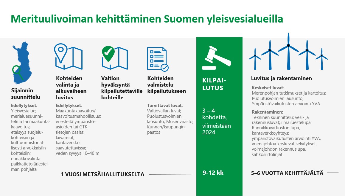 Merituulivoimahankkeiden kehittäminen käynnistyy vesialueiden esiselvityksillä, joiden perusteella valitaan huutokaupattavat alueet. Selvityksiin valitaan alueita, jotka soveltuvat alueellisen suunnittelun ja merialuesuunnitelman mukaan tuulivoiman tuotantoon. Suunnittelun eteneminen riippuu paikallisen kunnan mielenkiinnosta hankekehitystä kohtaan.
